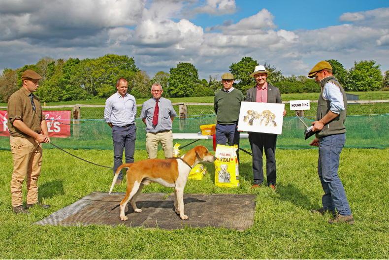 The Kilkennys Foxhounds after winning the Red Mills Champion Hound with Séamus at the Rockview Harriers Show. Pictured from (l-r) is Eddie Clews, whipper-in, Johnny Dicker, judges Joe Townend and Liam Geary, Sean Rafter Chairman of Kilkenny Foxhounds and Jamie Walsh, huntsman. The painting is a smashing print sponsored by Limerick artist Joanne Kavanagh