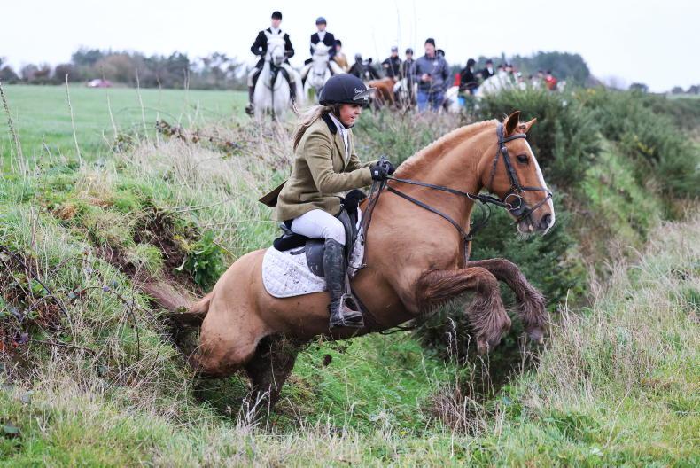 Sophie Mara takes on a a wide ditch on her great cob out with the Muskerry Foxhounds \ Catherine Power