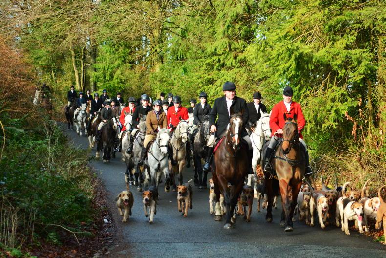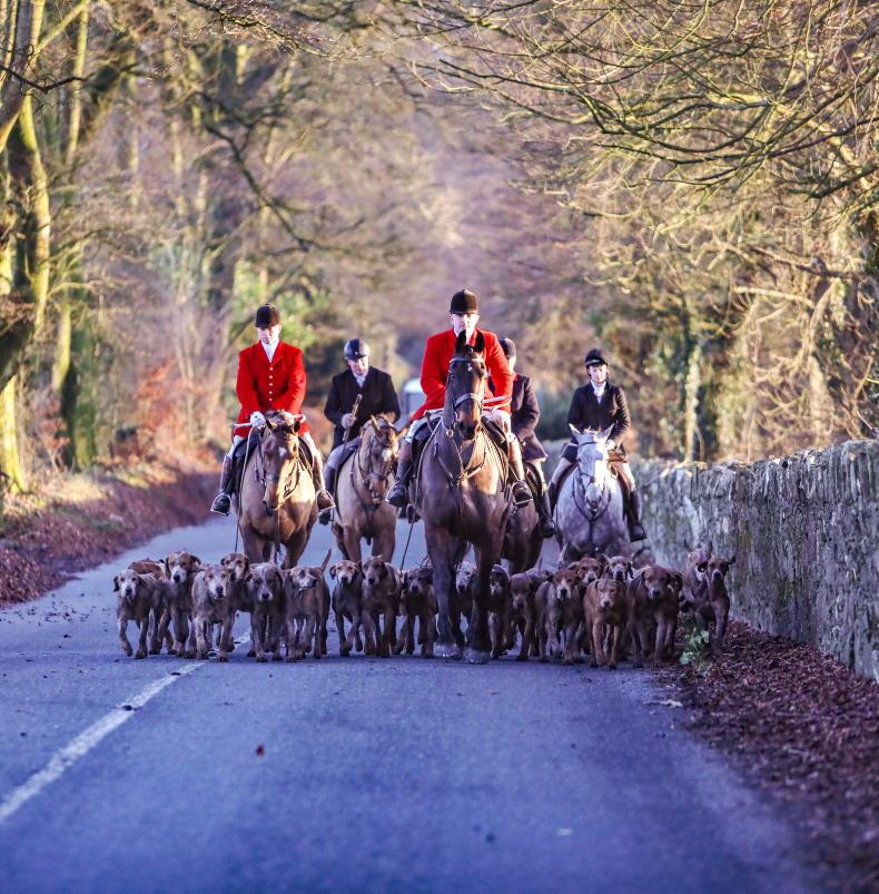 The Kildare Foxhounds, led by huntsman Padhraic Moynihan, heading back to the village of Dunlavin, Co Wicklow after the annual St Stephen's Day hunt which attracted over 100 mounted followers. Another 700-plus people turned out in the village that morning and generously donated €2,300 which will go towards the new astro turf football pitch in Dunlavin \ Siobhan Emglish