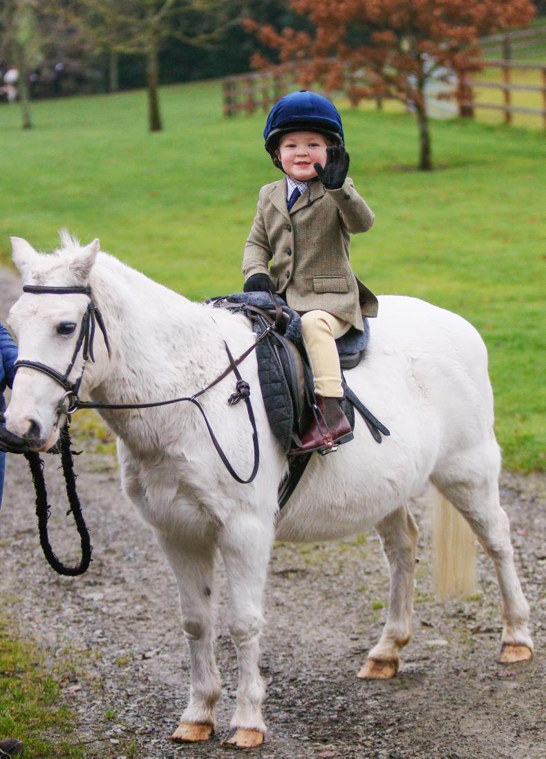 Three-year-old Sebastian Moore waves to the camera on his pony Luna during the children's meet of the Kildare Foxhounds from Grangecon \ Siobhan Emglish