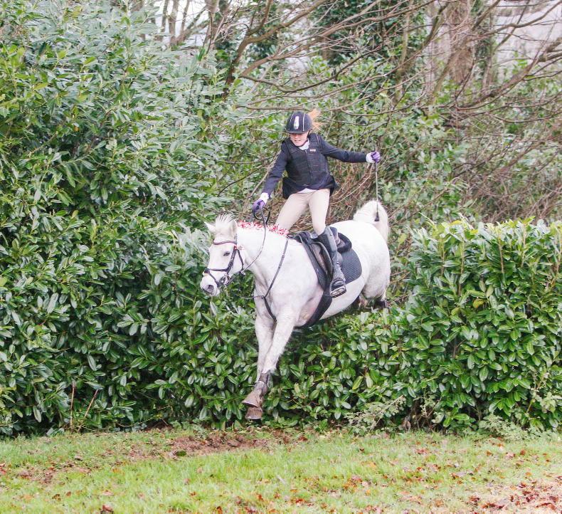 Lauren Moore is airborne while attending the children's meet of the Kildare Foxhounds from Grangecon. She dropped right back into the saddle and carried on hunting! \ Siobhan Emglish