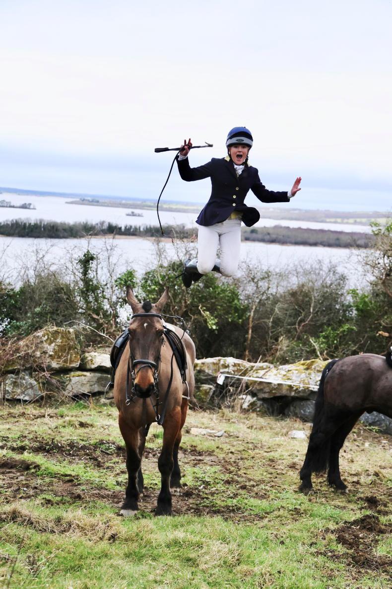 Clodagh Spain dismounts after a great day with the North Tipperary Foxhounds with Lough Derg in the background \ Catherine Power