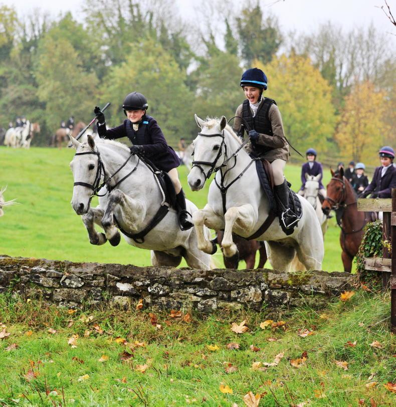 Robyn O’Reilly and Kitty Aspel taking on the wall at the opening meet of the Tipperary Foxhounds on their two lovely greys \ Catherine Power