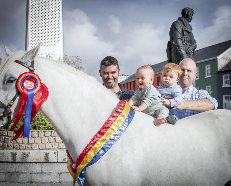 Next Generation: Bobby Nee and Colí O’Halloran ride the 2024 Supreme Champion Connemara pony Cabra Jane watched by their fathers Robert Nee and Bryan O’Halloran at the launch of the 2025 Clifden Show \ Rynes Walker
