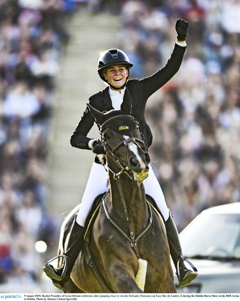 Rachel Proudley of Britain celebrates after jumping clear to win the Defender Puissance on Easy Boy de Laubry Z during the Dublin Horse Show \ Shauna Clinton/Sportsfile