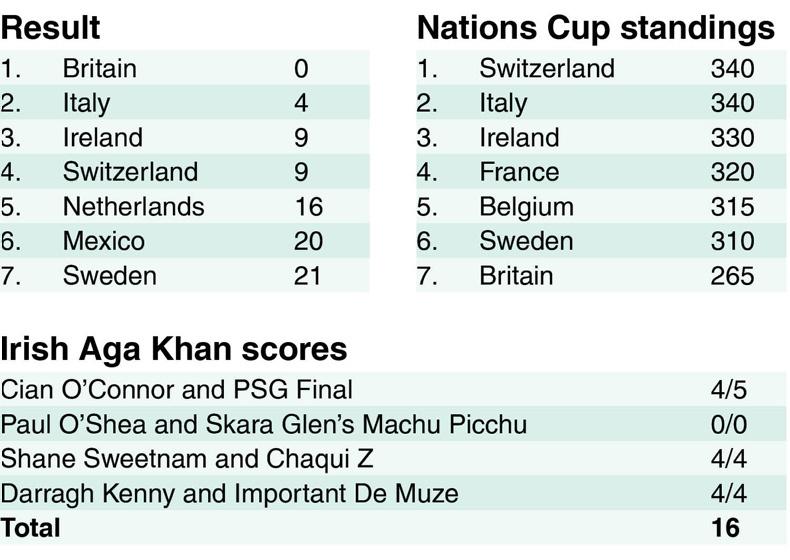 Sweetnam and Chaqui Z got away with a rub at fence nine but not at the first part of the combination (11a) when coming down on the back bar to complete with four faults once again. That score had to be counted which saw Ireland begin to drift away.