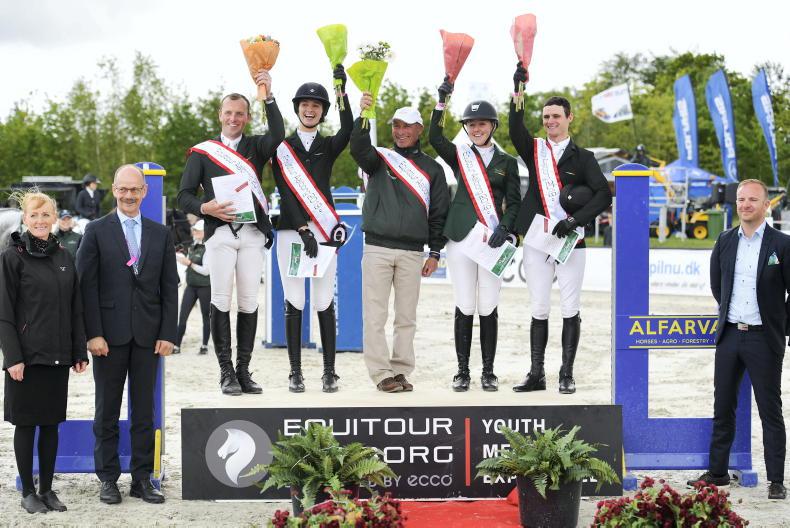 The Irish team of Ger O'Neill, Susan Fitzpatrick, chef d'equipe Taylor Vard, Jenny Rankin and Aidan Killeen won the three-star Nations Cup in Uggerhalne, Denmark in May 2019 \ Wiegaarden