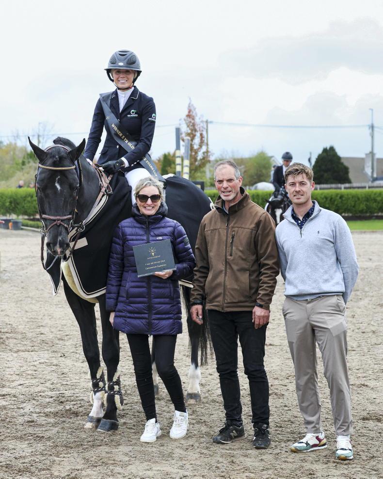 Leah Stack won the five-year-olds at Garranemore Equestrian with Jericho de Hus. Pictured with Cheryl Broderick, Brendan Doyle and Patrick Delaney \ Aisling Creative