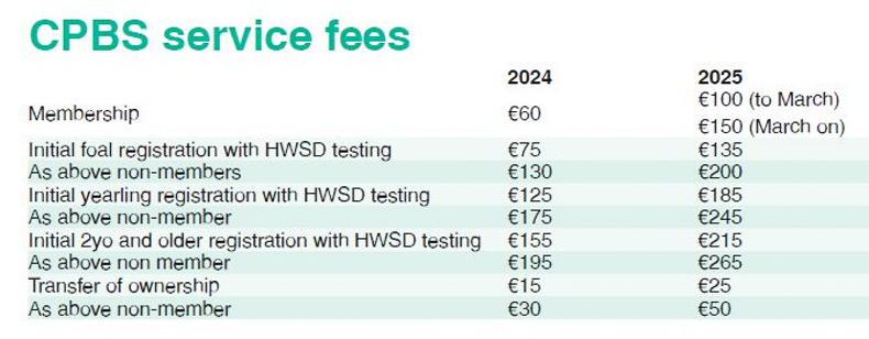 With regard to the price increases, the table below highlights some of the major changes in 2025, including membership, which will rise from €60 to €150 (up 150%) from March 2025 and initial foal registration with HWSD testing rising from €75 to €135 (up 80%) for members and from €130 to €200 (up 54%) for non-members.