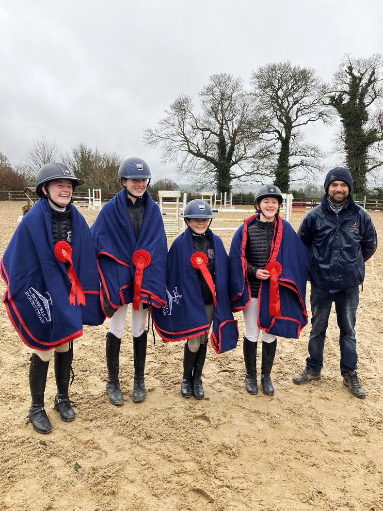 In Boswell, the EII novice teams commenced proceedings and, taking the red ribbons and gaining 10 league points was the team from Newbridge College; Caton Fought on La Vie Est Belle, Louise Maguire partnering Harry, Emili Smith and Caherdavin Blackjack and Ava Roseberg on Knockma Girl II. They were followed in second place by Loreto Bray represented by Anna Boucher Hayes on Brambles Bartholemew, Robin Boucher Hayes on Bella, Keeva Shaw riding Phoenix and Ruby Carvill Andrews riding Misty. Third place went to the St Gerard’s team of Nina Boydell and Arraghbeg Honey, Lily Malone and Harvey, Saoirse Di Bassi riding Poppy and Honor Mullian and Bella. Remaining league points were won by Borris VS, Tullow CS and St Mary’s Arklow.