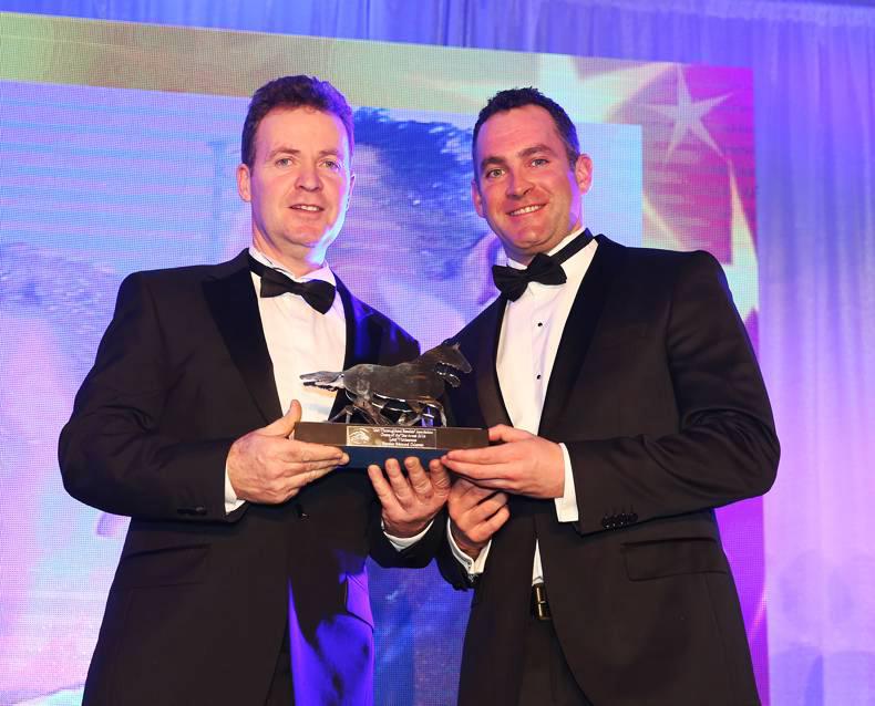 GERARD MCGRATH RECEIVING HURDLER OF THE YEAR AWARD FROM NICK NUGENT, GOFFS, FOR JEZKI