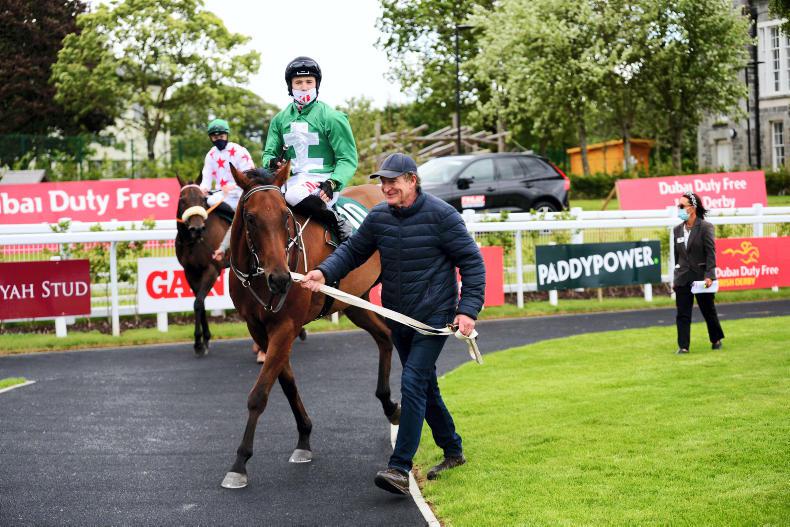 However, the accompanying picture tells what the victory meant, as the four-year-old Strong Johnson is led up by his owner, breeder and now ‘lad’ for the day, David Mooney of Treascon Stud. This was the gelding’s third win over five furlongs and he has been highly consistent, also being placed four times from just nine starts. His earnings now stand at just over €65,000.