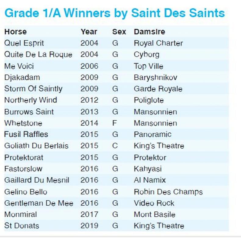 A Grade 2 winner and Grade 1-placed hurdler, Saint Des Saints is a giant of the National Hunt world in France, and his influence has extended well beyond his native shores. Now 25 years old, he has commanded a fee of €15,000 since 2017, and that will be the price again in 2024. His list of Grade 1/A winners in printed on this page, but his tally of blacktype winners now stands at 94 – a truly remarkable number.