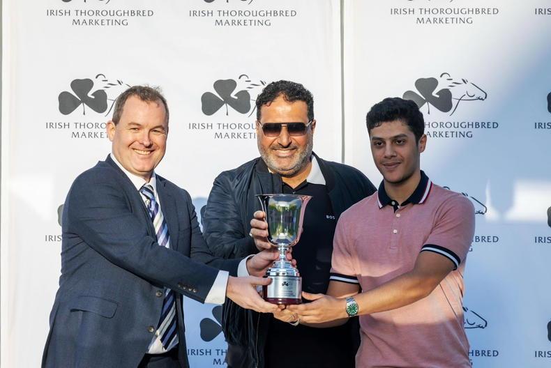 Pictured (l-r) are Jeremy Greene of Irish Thoroughbred Marketing, owner Abubaker Kadoura, and Abubaker’s son Osama. The ITM-sponsored race was won by ex-Joseph O’Brien trainee Shepperton Lodge. Abubaker was busy buying at the Orby Sale last year under the Local Creator banner