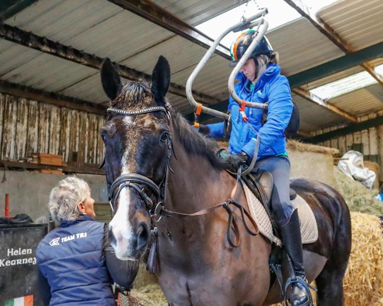 Assisted by Rose Rouse, Helen is lifted onto her horse Benny by a hoist developed by her father Michael \ Siobhan English Photography
