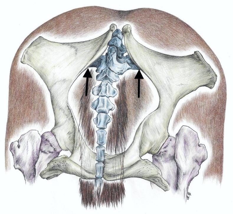 The sacroiliac joint (SI) is the only bony connection between the horse’s hindlimb and the vertebral column. The joint is composed of two major bones: the wing of the ilium, part of the pelvis, and the wing of the sacrum, part of the spine. Two SI joints sit on either side of the spine. The joints’ main function is to connect the hind limbs to the rest of the skeleton with minimal movement in the joint itself. It transfers forces from the hindlimb during weight bearing through to the vertebral column. The ligaments and muscles surrounding the joint play an essential role in supporting the joint.