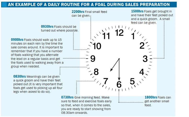 0730hrs Give morning feed. Make sure to feed and exercise foals early so that, when it comes to the sales, you are ready to start showing from 08:30am onwards.