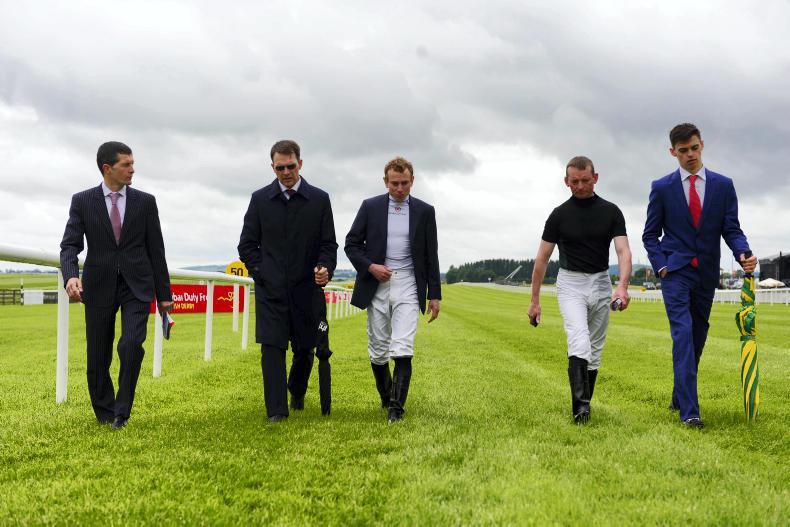 CURRAGH 25-6-2016. Dubai Duty Free Irish Derby. Trainer AIDAN O'BRIEN (2nd left) walking the course with his jockeys (L-R) Colm O'Donoghue, Ryan Moore, Seamie Heffernan and Donnacha O'Brien. Photo HEALY RACING.