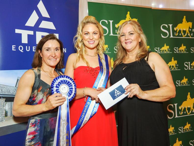 Amory McMahon receives her sash and prize from Lorraine Keith of TRI (sponsor) after winning the overall title in the middleweight division with Woodfieldfarm Baloo. Also pictured is Nicola Perrin who presented rosettes to the top six \ Siobhan Engligh