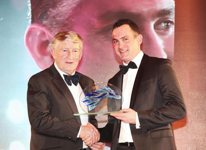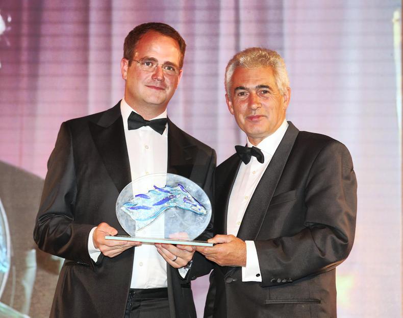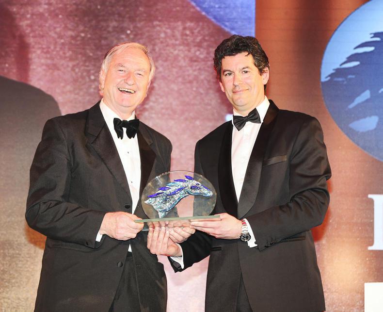 Altior's breeder Paddy Behan accepts the Young National Hunt Horse award from Ronan Murphy of Weatherbys Ireland