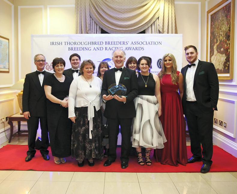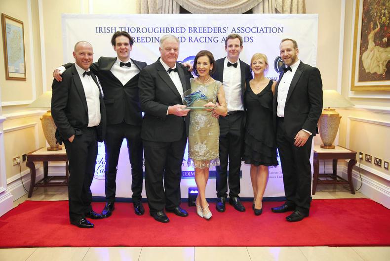The Three-Year-Old Colt award was shared between The Gurkha and Ribchester. Pictured here are Coolmore's David O'Loughlin (for The Gurkha), award sponsor Gerry Duffy of Darley, and Ribchester's breeders Michael O'Brien and Andrew Thompson