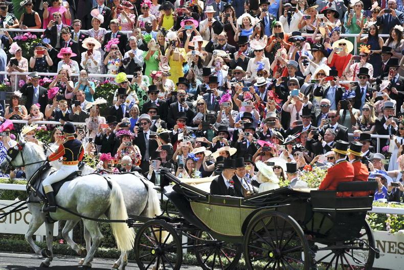 The sun is baking down at a sultry 27 degrees and way down the enclosure at the three-furlong pole, there are gangs and gangs and gangs of ladies pouring into what is now called the Windsor Enclosure. All carrying fold-up chairs, blankets and bags packed with food, I presume. All grabbing their spot on the yellow parched grass lawns. Sure, it’s like Ballybunion without the beach.