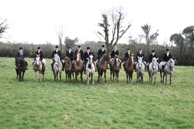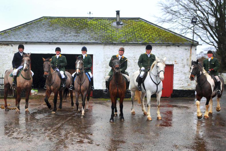 Brian Geissel captures the South County Dublin Hunt at last weekend's meet at Goffs. In the centre is Huntsman Paul Kerr followed by his three daughters Catherine, Grace and Eve, Master Niall Byrne and Chairman Kevin Mulvey (Photo: Brian Geissel)
