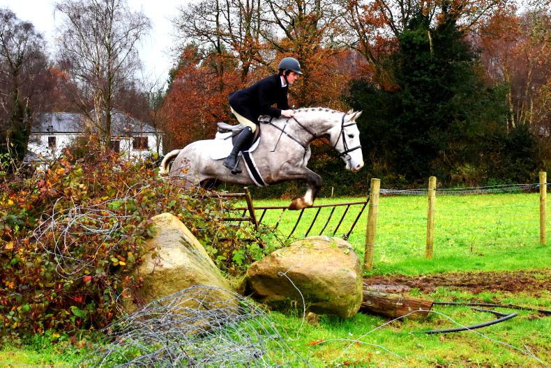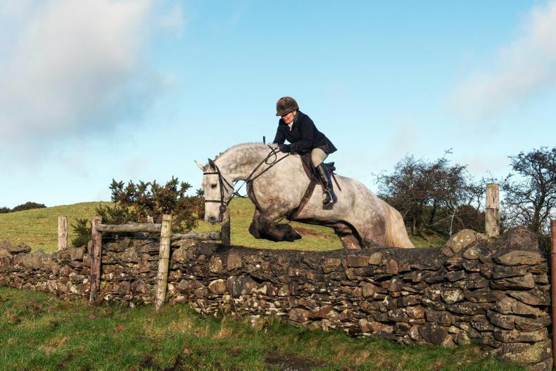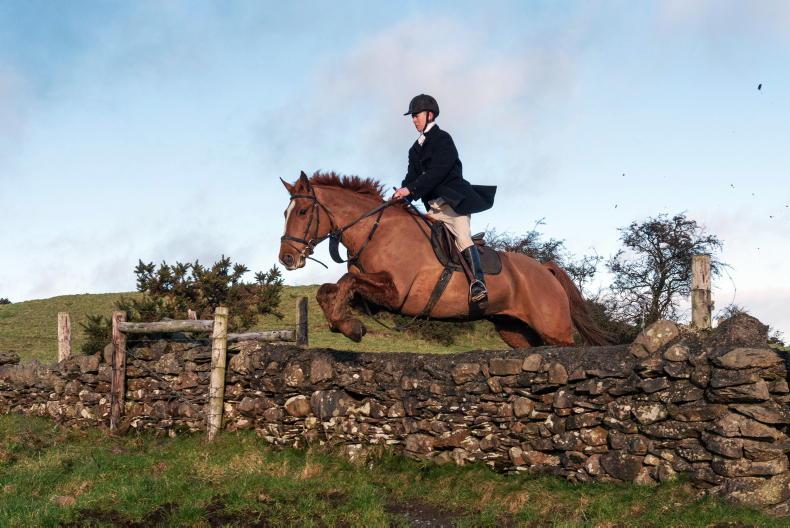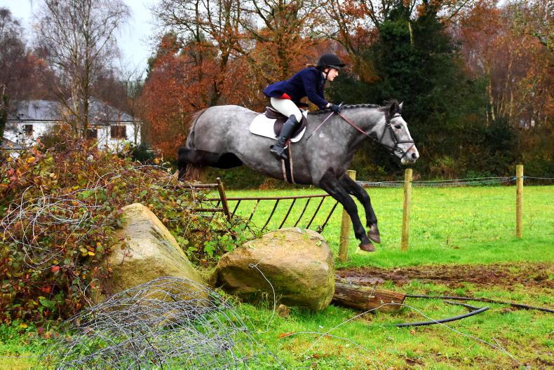 Cooley Farms Irish Draught ridden by Sarah Anne Law jumping a gate at the Wicklow Foxhounds meet at Coolgreany \ Noel Mullins