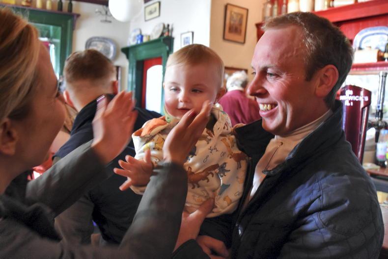 Huntsman Niall Dunne and his son Arthur and Hannah McCormack at the Westmeath Foxhounds meet at Nick Murtagh’s Bar in Ballynacarrigy \ Noel Mullins