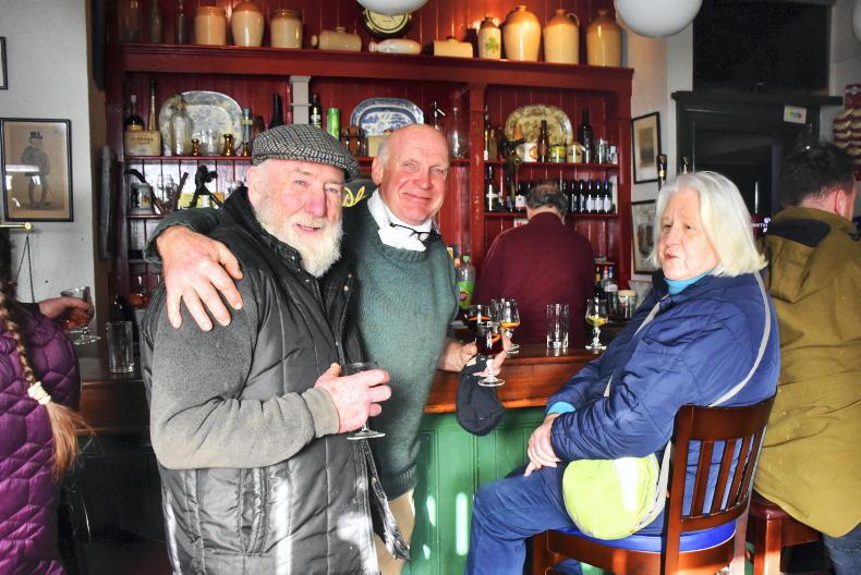 Bloodstock breeder Michael Farrell, Bridge House Stud owner Trevor Badger and Maevis Murray at the Westmeath Foxhounds meet at Murtagh’s Bar in Ballynacarrigy \ Noel Mullins