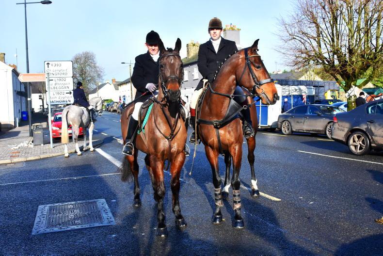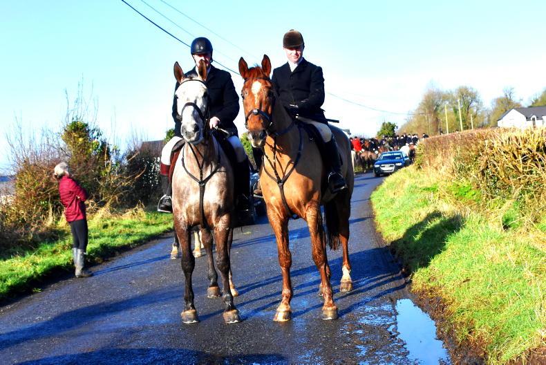 Kieran Flynn and Graham Dempsey hunting at the Westmeath Foxhounds meet at Murtagh’s Bar in Ballynacarrigy \ Noel Mullins