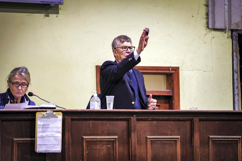 Martin Donohue back holding the hammer at Goresbridge Horse Sales last week \ Aoife Kavanagh/Between The Ears