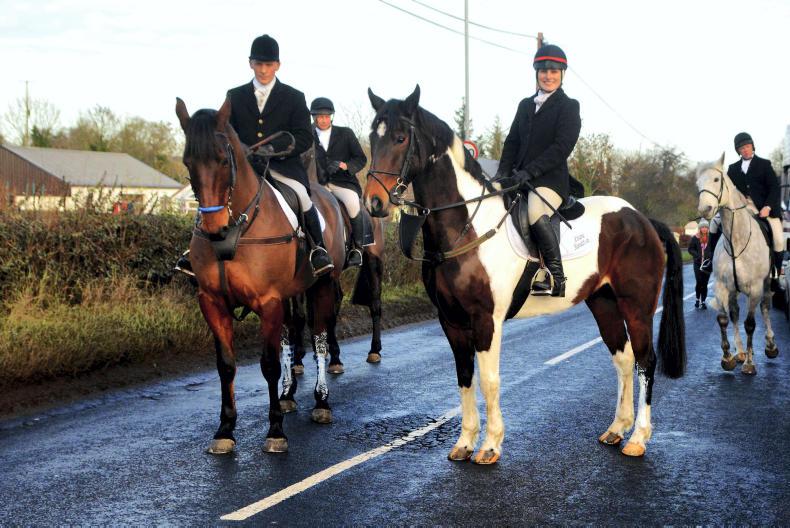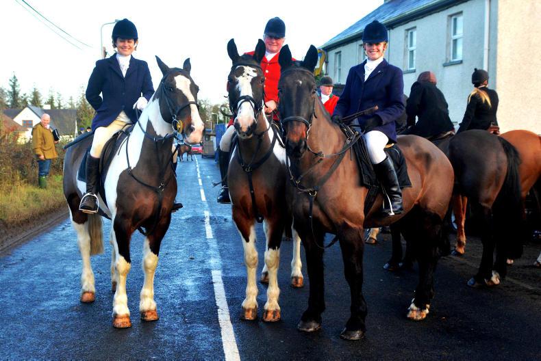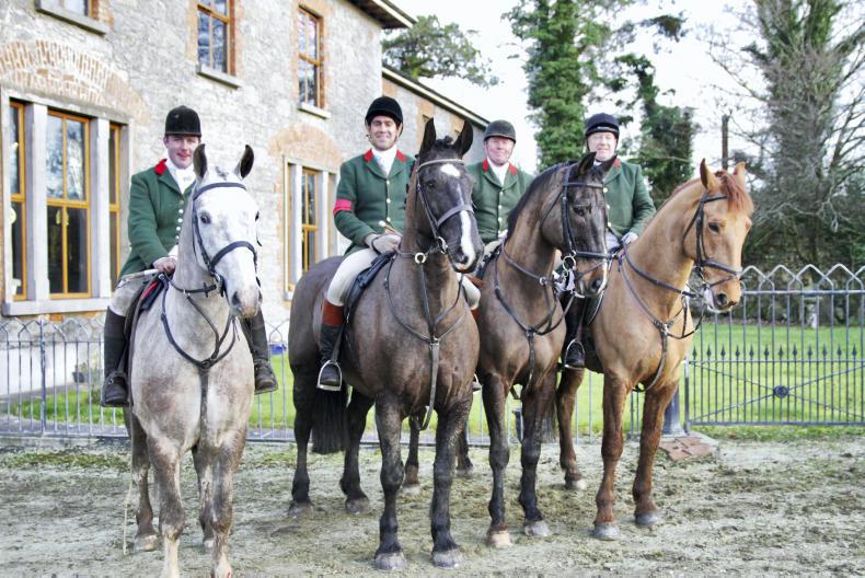 Showhorse producer PJ Casey standing in for the Fingal Harriers huntsman Chris Smith who produced a Red Letter Day at Oldtown and is seen with whippers-in Stephen Comerford and Joey Moore (Photo: Noel Mullins)