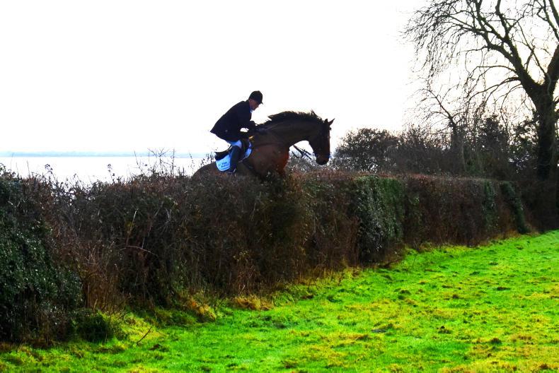 Honorary whipper-in Paul Kinane taking on a hedge beside Lough Neagh with the South Tyrone Foxhounds at Ardboe (Photo: Noel Mullins)
