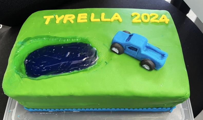 Also at Tyrella, there was a futile wait in the secretary’s office for Nichola Wray to produce her usual, very popular lemon drizzle traybake. Nichola, who finished third in the EI110 (Amateur) on Dylan, decided to mark the start of the campaign with the cake above, which depicts the amount of water that fell on the Co Down venue over the past few weeks and the horse power needed to work on the cross-country course.