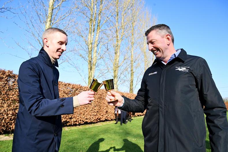 Mark Walsh and Gavin Cromwell at Danestown Stables following Cheltenham Gold Cup winner Inothewayurthinkin home coming party \ Healy Racing