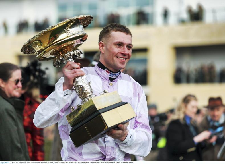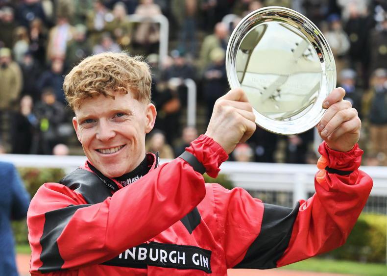 Lorcan Williams with the Champion Hurdle trophy \Sportsfile