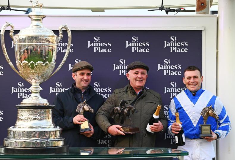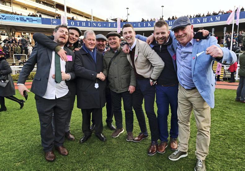 Owner John O'Leary and friends with JP McManus after their Wonderwall won the St. James's Place Festival Challenge Cup Open Hunters' Chase \ Healy Racing