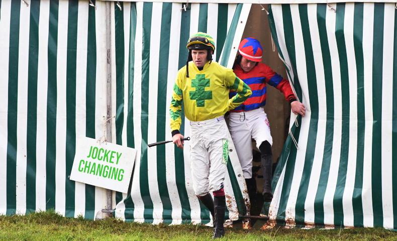 Be My Fortune and Rob James (light blue) part company at the final fence in the four-year-old maiden at Castletown-Geoghegan. Thankfully all were okay afterwards \ Healy Racing