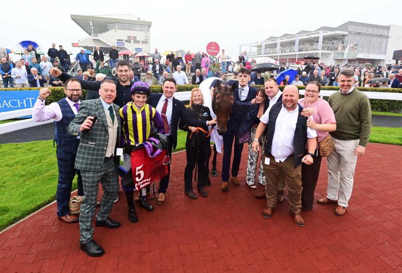 Genuine Article and Seamie Heffernan win for owners Wear A Pink Ribbon Syndicate with members Tom Fallon, Tony Brady and John Kelly celebrating \ Healy Racing