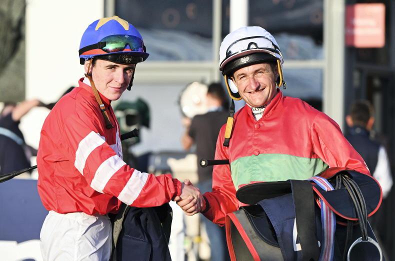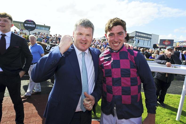 Ndaawi's jockey Jack Kennedy and trainer Gordon Elliott celebrate their win in the Hurdle \ Healy Racing