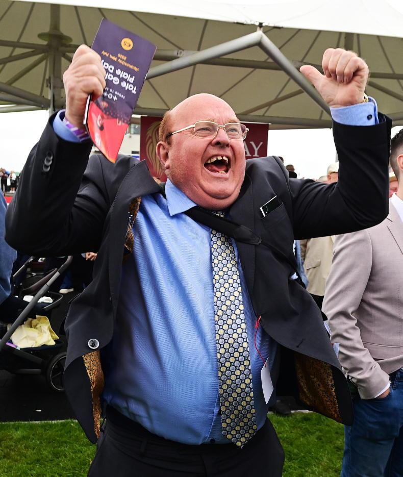 Owner John O'Mahoney of Man About Dog Syndicate cheers home Bal Kauto under Declan Queally \ Healy Racing