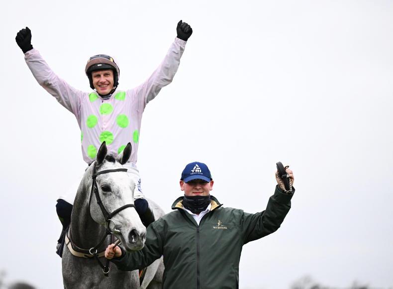 Paul Townend celebrates Lossiemouth winning the December Hurdle with groom Dick Dowling \ Healy Racing