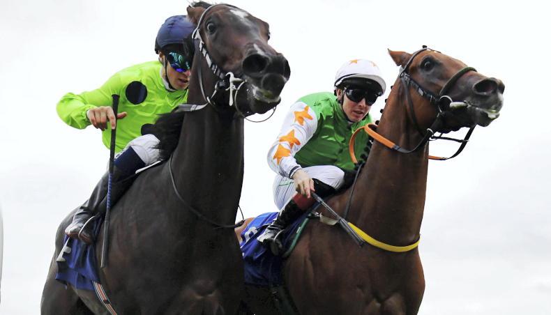 Head to head: Check This Out and Colin Keane (right) win the Irish EBF Auction Series Maiden at Roscommon from Giovannu Giorgio and Dylan Browne McMonagle \ Healy Racing