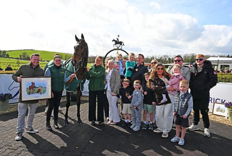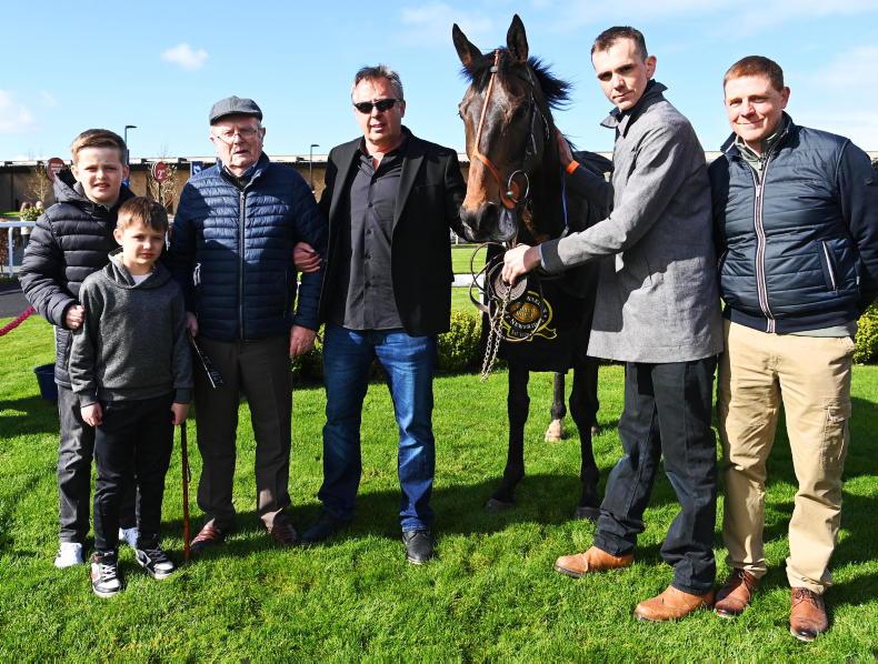 Cheltenham Festival winner The Mourne Rambler on parade for owner Philip Polly (left) and family and friends at Downpatrick \ Healy Racing