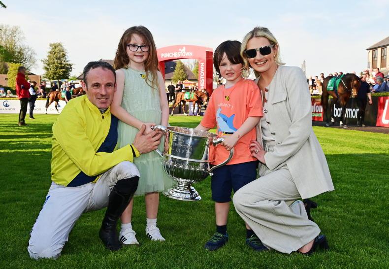 Sean Flanagan and wife Lauren with kids Lilah and LJ after Marine Nationale won the William Hill Champion Chase \ Healy Racing