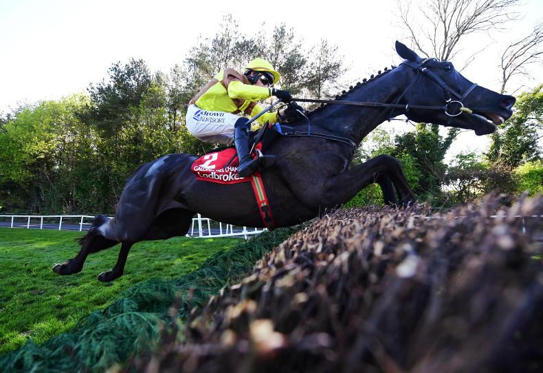Galopin Des Champs and Paul Townend jump the second last on his wayh to winning the Grade 1 Ladbrokes Punchestown Gold Cup \ Healy Racing