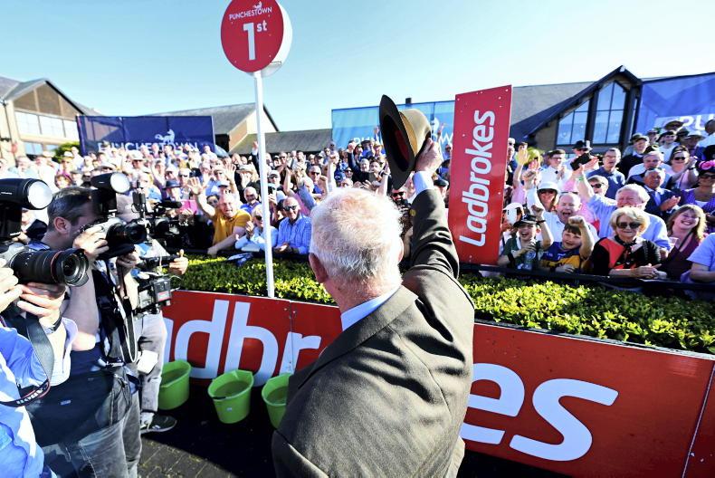 Willie Mullins greets racegoers in the winners enclosure after Galopin Des Champs won The Punchestown Gold Cup \ Healy Racing
