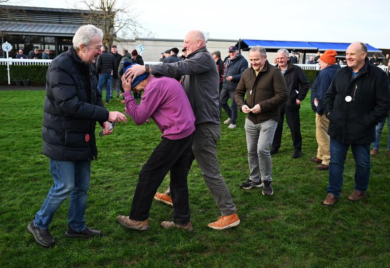Shellrunforbriggs' winning trainer Mick Winters is embraced by Syndicate member Maurice Sheehan after their Naas win \ Healy Racing