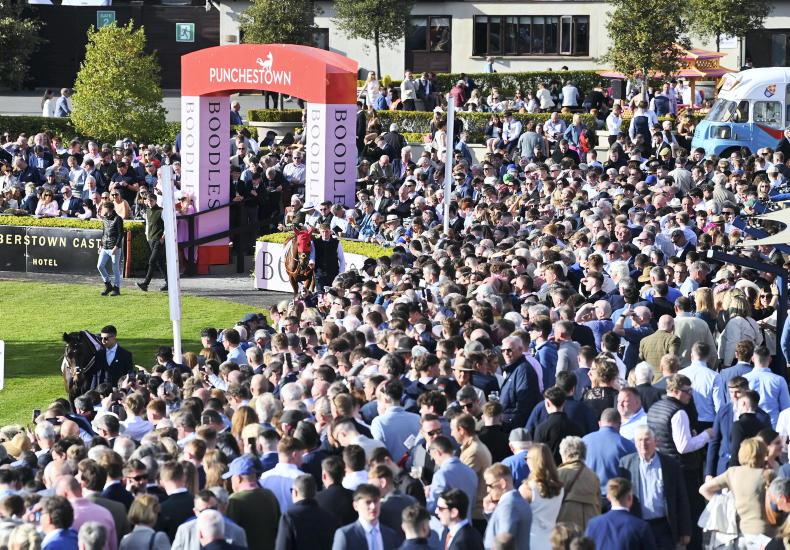 Punchestown, May. Constitution Hill in the parade ring surrounded by a packed enclosure before the Boodles Hurdle \ Healy Racing